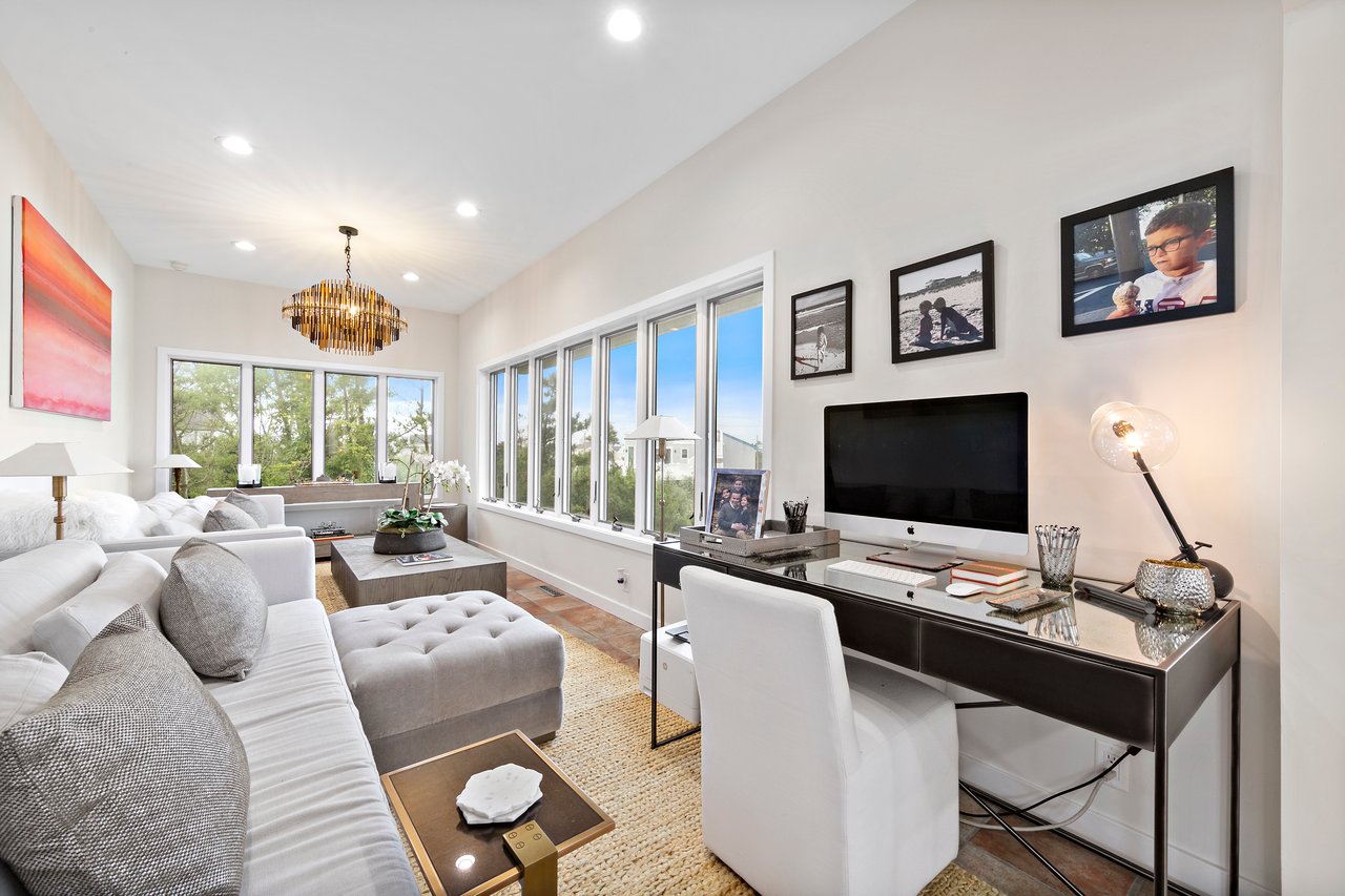 A large open great room sits at the heart of the house appointed with a fireplace and a wall of glass sliders to the oceanfront deck - all backdropped with Atlantic views. The open layout continues into the dining area, updated gourmet kitchen, and family room.