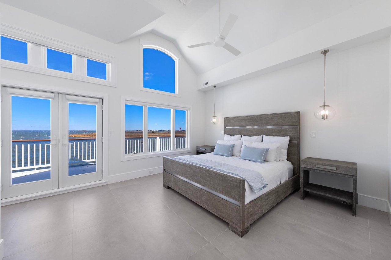 The main house offers a master suite that redefines luxury. With stunning window walls overlooking the bay, this private retreat features the most extravagant master bath—complete with an opulent vanity, marble flooring, and a multi-head, all-glass walk-in rain room shower that feels like your personal spa haven.